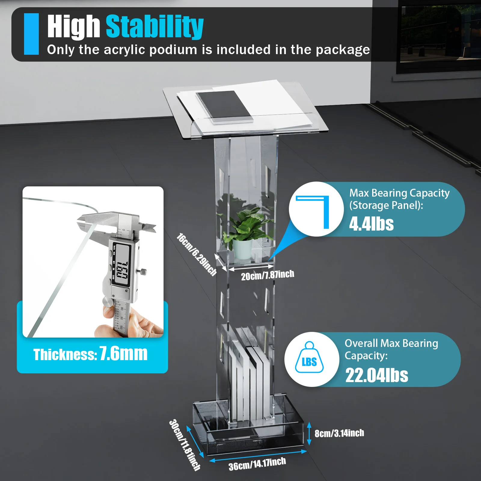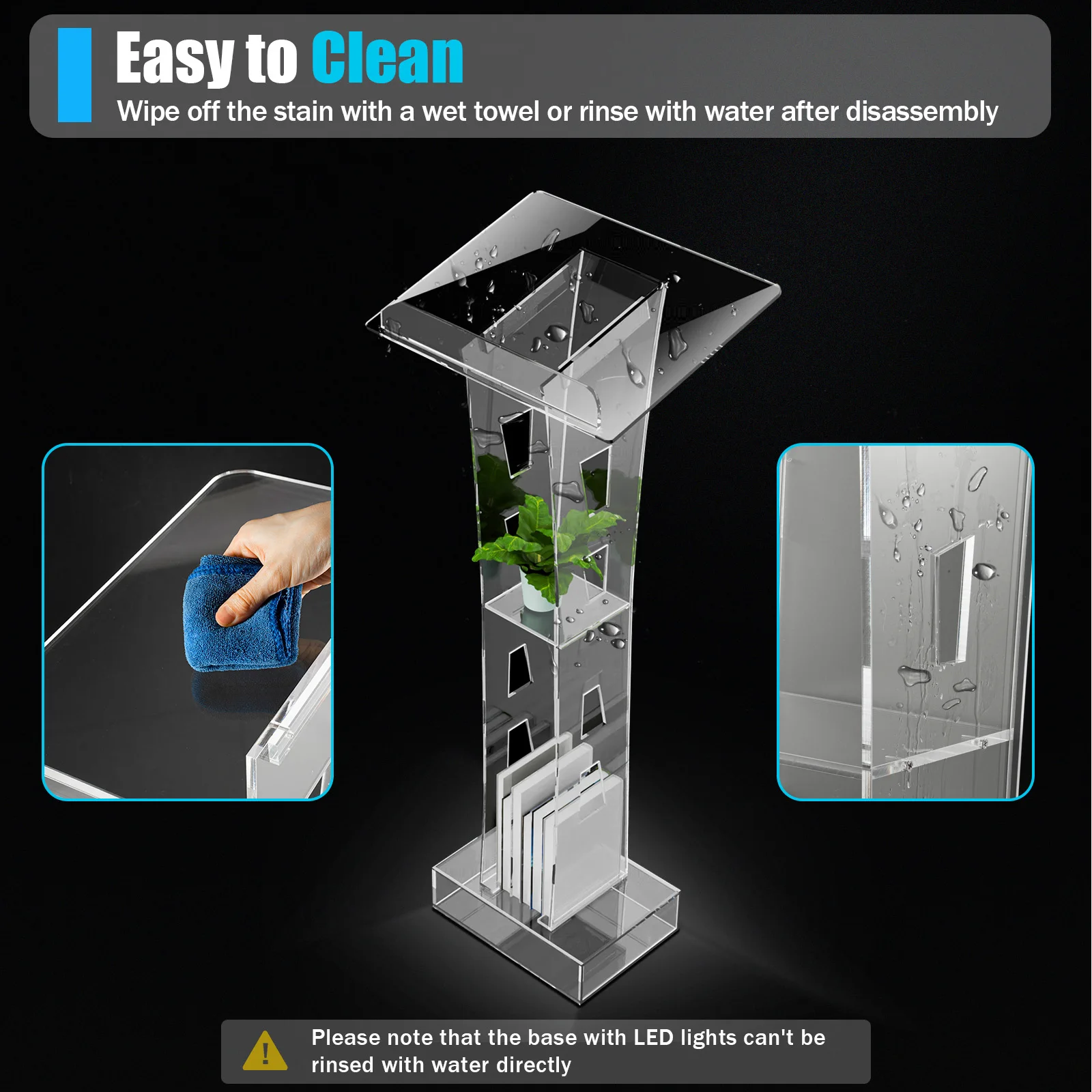 Eine professionelle Präsentationspodium ist der Mittelpunkt moderner Konferenzen und besonderer Anlässe.Unser durchsichtiges Acrylpodium kombiniert idealerweise einzigartige Designästhetik mit praktischen Funktionen und bietet so eine professionelle und ausdrucksstarke Bühne für Lautsprecher.Das blaue LED-Licht sorgt für einen atemberaubenderen visuellen Effekt Ihrer Präsentation.Das Lesepanel und das zusätzliche Aufbewahrungspanel bieten viel Platz für die Unterbringung von Gegenständen, die Sie während der Präsentation benötigen.Während der Präsentationen ist ein solcher guter Helfer notwendig.