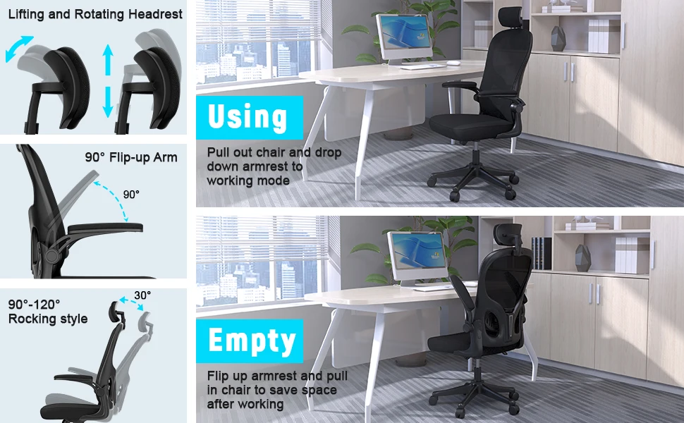 Empty: Flip up armrest and pull in chair to save spaceafter working
