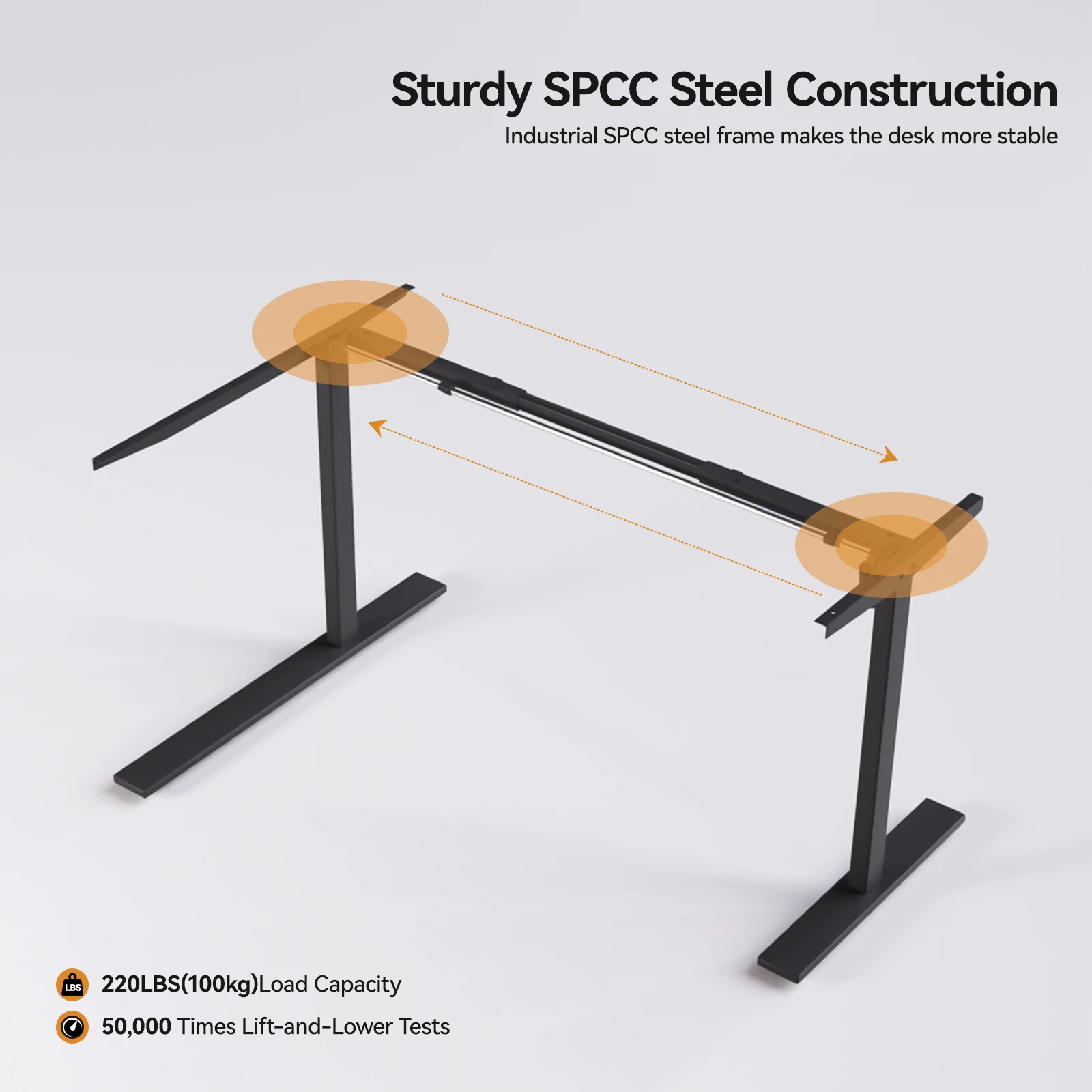 Dieser Schreibtisch verfügt über eine robuste SPCC-Stahlkonstruktion.Der industrielle SPCC-Stahlrahmen erhöht die Stabilität und ermöglicht eine Last von bis zu 100 kg.Es hat außerdem 50.000 Hebe-Unter-Tests bestanden und gewährleistet so Haltbarkeit und Zuverlässigkeit für den Langzeitgebrauch.